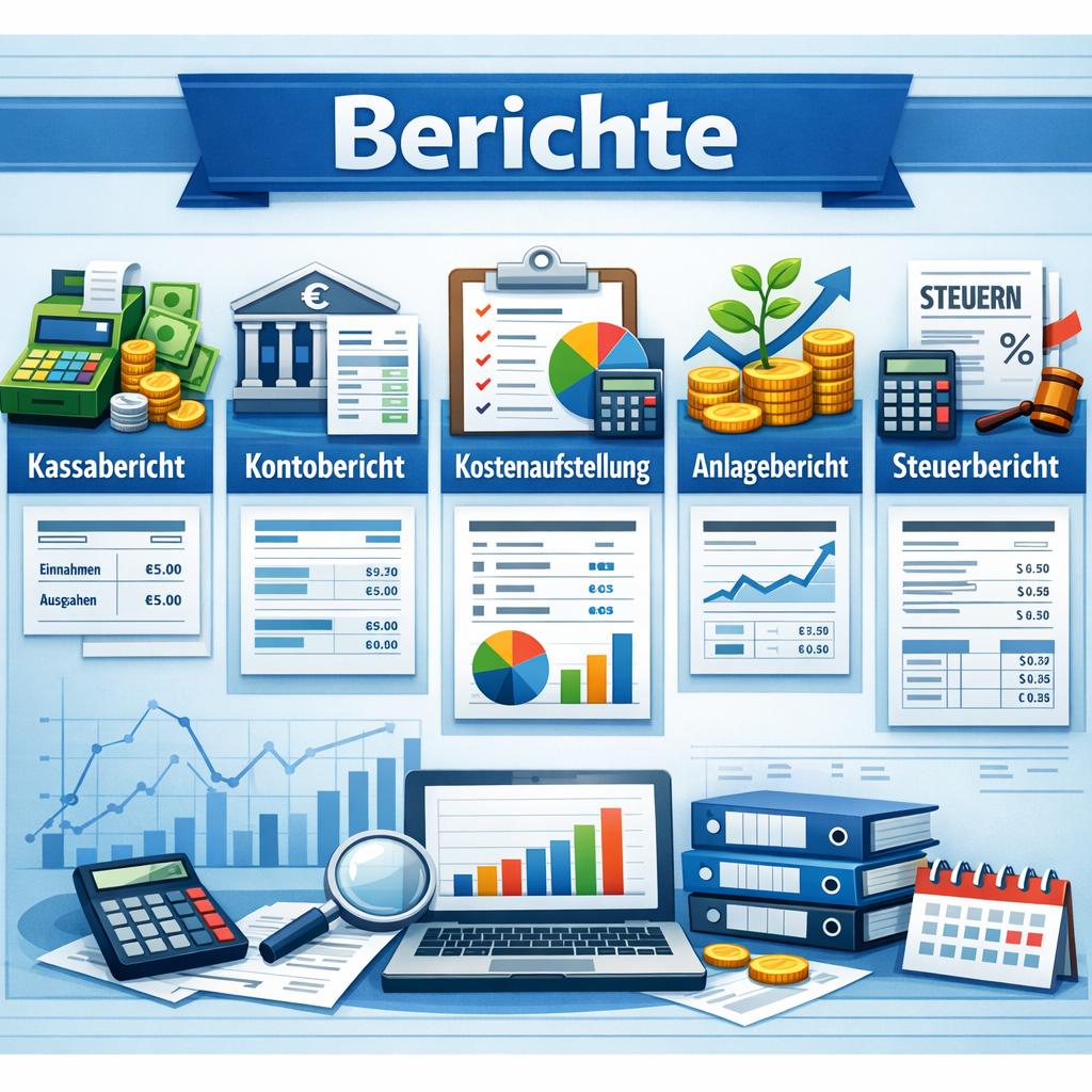 Berichte können laufend, über das ganze Jahr, erstellt werden. Vom Konto- über den Kassabericht, den Steuerbericht, Anlagenverzeichnis und viele mehr.